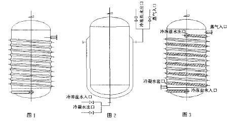 該廠大部分“U”夾套結(jié)構(gòu)反應(yīng)釜為常壓操作,而“U”型夾套內(nèi)常通 人0.3MPa-0.6MPa的蒸汽加熱,按《壓力容器安全技術(shù)監(jiān)察規(guī)程》劃分, 為類(D1級(jí))壓力容器。有些反應(yīng)釜內(nèi)是冷~熱間隔操作的,有時(shí)夾 套會(huì)出現(xiàn)使用冷凍鹽水降溫后再通入蒸汽的工況,這樣一旦誤操作會(huì)發(fā)生冷凍鹽水流失,造成浪費(fèi)(見圖2)。采用雙螺旋半圓管夾套,使冷凍鹽水和蒸汽各行其道,可以徹底杜絕傳熱介質(zhì)摻混和流失的問題(見 圖3)。鑒于以上原因,我們對(duì)該廠的這一類型設(shè)備進(jìn)行了更新和改造, 設(shè)計(jì)了半圓管夾套來代替“U”型夾套。